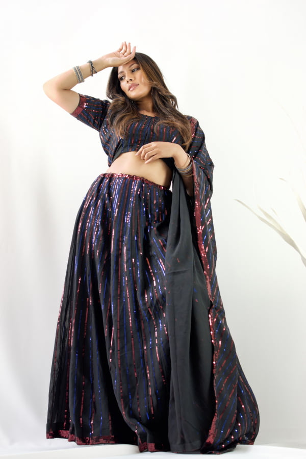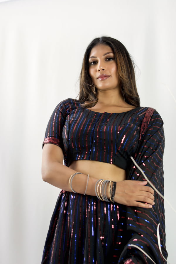 Ce Lehenga noir est une pièce d'exception qui incarne l'éclat et le glamour. Sa jupe est ornée de sequins scintillants qui captivent la lumière, créant un effet étincelant à chaque pas que vous faites. La blouse assortie, taille S-M (ajustable chez le couturier par vos soins), est conçue pour épouser élégamment votre silhouette.