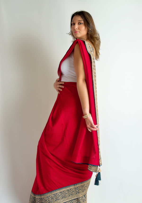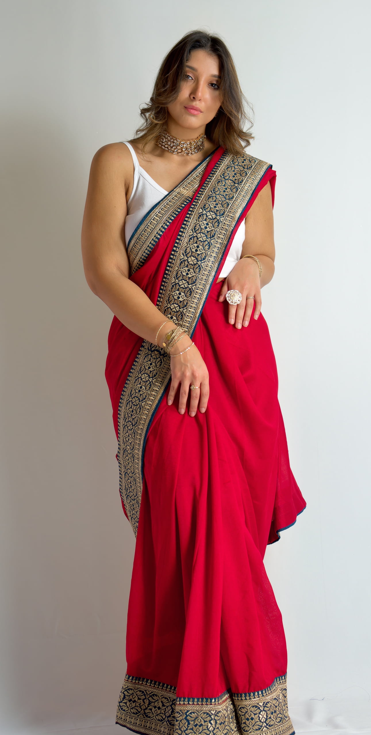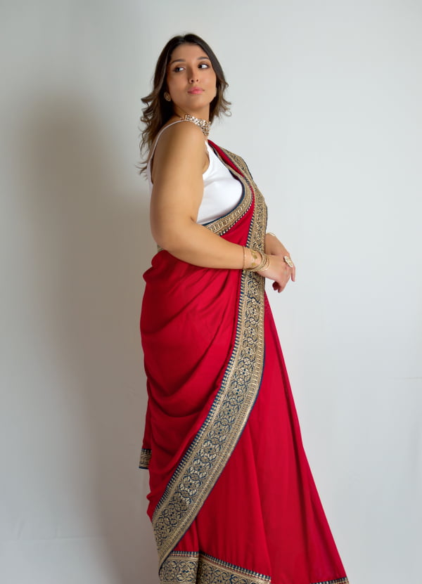Explorez la beauté envoûtante de notre Sari en Vichitra Silk. Dans une teinte vive de rouge, ce sari dégage une aura de féminité captivante. Le travail de broderie Zari, agrémenté de pompons, ajoute une touche de glamour subtile, tandis que la bordure en dentelle complète avec délicatesse cette pièce unique. Un sari simple mais sophistiqué, parfait pour vos moments les plus spéciaux.